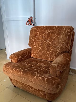 Es un sillón individual de estilo antiguo. - Tapicería de terciopelo. - Diseño clásico con botones. - Patas de madera oscura.
