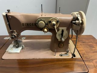 Máquina de coser Singer con más de 50 años de antigüedad. Un clásico para coleccionistas o amantes de la costura. - Diseño vintage. - Cuerpo principal en tono beige. - Detalles en color marrón.