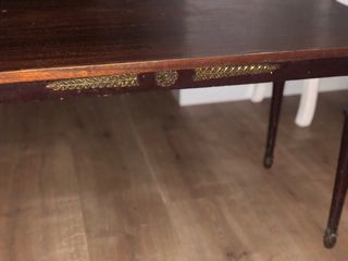 Elegante mesa de estilo antiguo y vintage, con detalles decorativos que le aportan un toque único. - Diseño con incrustaciones doradas. - Combinación de madera y metal.