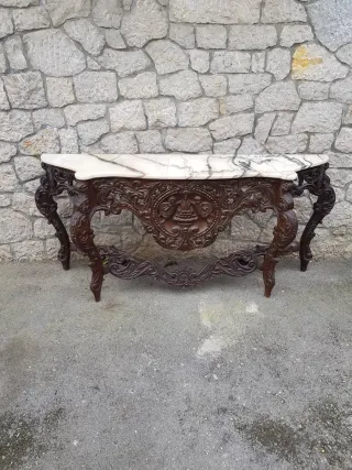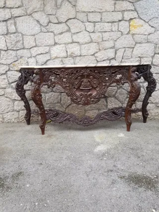 Elegante consola antigua con una preciosa tapa de mármol y una base de madera finamente tallada a mano. - Diseño intrincado y detallado. - Acabado artesanal.