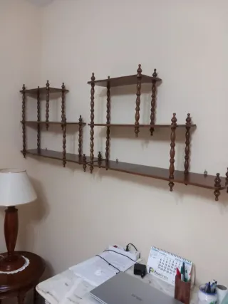 Conjunto de estanterías de madera con un diseño clásico y elegante. - Estructura de madera robusta. - Acabado en tono marrón oscuro. - Diseño de tres niveles. 15 euros cada una