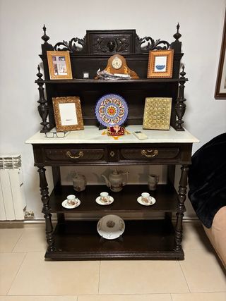 Elegante aparador de estilo antiguo. - Encimera de mármol. - Estructura principal de madera. - Detalles dorados en los tiradores. - Con dos cajones para almacenamiento. Solo venta en persona. PRECIO NEGOCIABLE