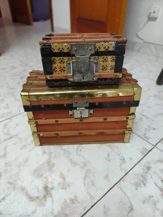 Conjunto de dos cajas de almacenaje con un diseño vintage. - Acabados en metal y madera. - Detalles en color dorado y marrón.