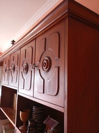 de madera buen estado puertas de crital se compone de 2 piezas mesado con cajones y vitrina No incluye nada de su interior!! medidas: 106 ancho 30 profundidad 2 metros de alto hasta el pico tallado de madera 185 quitando la ornamentacion de madera