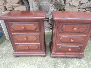 Conjunto de dos mesitas de noche de estilo antiguo. Fabricadas en madera con un acabado en tono marrón oscuro. - Diseño clásico con molduras. - Cada mesita tiene tres cajones. - Tiradores redondos de madera. Base de 53, fondo de 34 y altura de 65cm