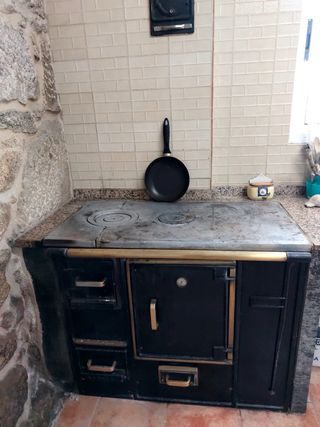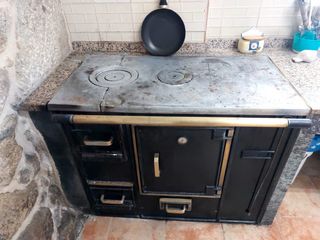 Se vende cocina de hierro antigua, un elemento con carácter para tu hogar. - Diseño robusto y duradero. - Acabados en negro y detalles dorados.
