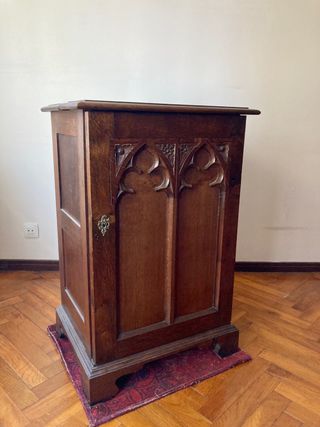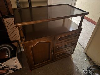 Mueble de madera oscura con un diseño clásico y detalles tallados. - Estilo antiguo. - Incluye cajón. - Cerradura decorativa. Sólo venta en persona!