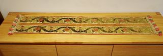 Precioso camino de mesa antiguo en tejido brocado, con pasamanería y borlas en los extremos. Diseño floral. Forrado. Queda muy bonito en un mueble moderno. 150 cm x 29,5 cm.