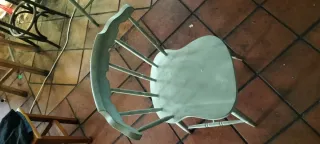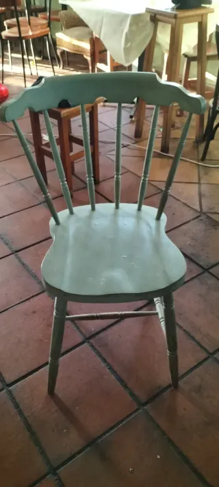 Conjunto de cuatro sillas antiguas de madera. Su diseño clásico aporta un toque rústico y vintage a cualquier espacio. 10 cada silla - Estructura robusta de madera. - Acabado en tonos verdes y marrones.