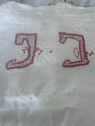 Preciosa sábana antigua de lino con bordado de iniciales. - Iniciales bordadas en color granate. - Diseño floral decorativo. En tres lienzos