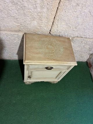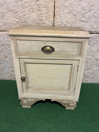 Mesilla auxiliar restaurada con un encantador acabado en tonos beige y dorado. Su diseño clásico la hace perfecta para cualquier rincón. - Patas con detalles ornamentales. - Tirador metálico en el cajón. - Puerta con pomo a juego.
