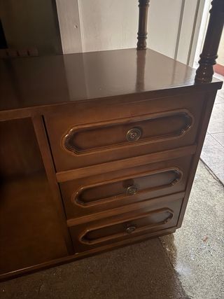 Mueble de madera con un diseño clásico y elegante, perfecto para tu salón. - Cuenta con tres cajones y un compartimento con puerta. - Acabado pulido y detallado.