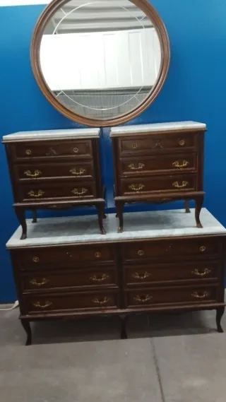 Conjunto de muebles antiguos de madera oscura, ideal para un dormitorio con estilo. Si venis por dormitorio por 80€ lo dejo. - Incluye un armario de cinco puertas dos mesitas de noche y una cómoda con espejo. - Cada mesita tiene tres cajones con tiradores dorados. - La cómoda cuenta con seis cajones y un espejo con marco de madera. - Las superficies de las mesitas y la cómoda son de mármol.