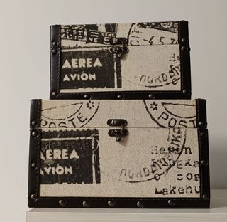 Conjunto de dos baúles decorativos con un diseño inspirado en sellos postales y mapas antiguos. - Diseño vintage con motivos de Aerea Avion y Poste. - Acabado en tela y detalles en polipiel. - Cierres metálicos decorativos.