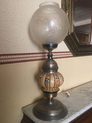 Lámpara antigua de latón, cuerpo de cerámica y tulipa de cristal en muy buen estado