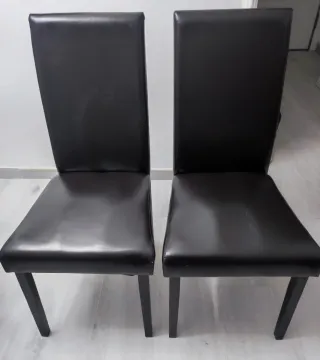 Conjunto de dos sillas de comedor con un diseño moderno y elegante. Ambas sillas están en perfectas condiciones, tienen algunos roces mínimos en alguna de las esquinas al igual que en el canto de alguna de las patas. Por lo demás están como nuevas. - Tapicería en polipiel. - Patas de madera oscura.