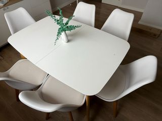 Elegante mesa de comedor con un diseño moderno y limpio. Perfecta para reuniones familiares o cenas con amigos. - Acabado en blanco - Patas de madera robusta -extensible a 2 mts - opcion de añadir las 4 sillas