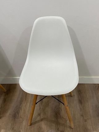 Conjunto de sillas de comedor con un diseño moderno y elegante. - Asientos de plástico blanco. - Patas de madera.