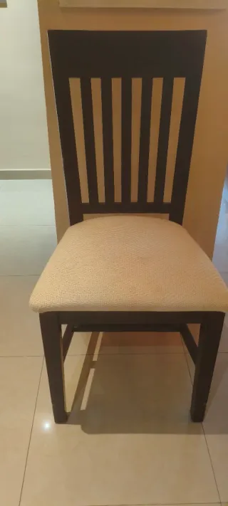 Conjunto de 4 sillas con un diseño elegante, perfectas para tu salón o comedor. Estructura de madera oscura. Asiento tapizado en tela color beige algo manchado. 5€ cada una.