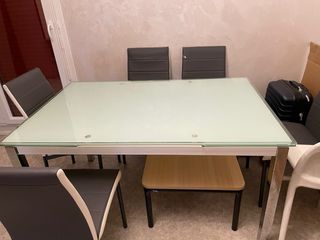 mesa de cristal muy poco usada y cuatro sillas en perfecto estado. la mesa es extensible puediendo comer 8 personas muy ampliamente. La mesa abierta mide 200cm. Solo se vende en persona.