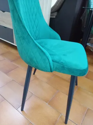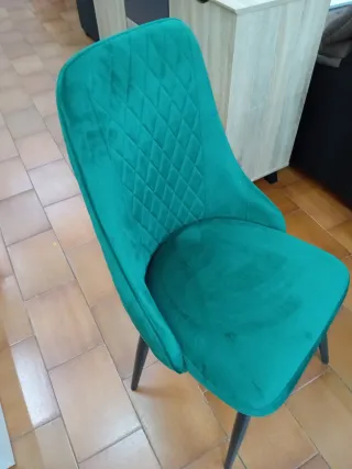 Elegante silla tapizada en terciopelo de color verde. Su diseño moderno y cómodo la hace perfecta para cualquier comedor. - Patas de madera oscura. - Respaldo acolchado con diseño capitoné.