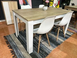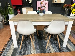 Conjunto de mesa de comedor con cuatro sillas. - Mesa con sobre de madera y patas blancas. - Sillas de diseño en color blanco con patas de madera. Medidas: Largo: 138 cm Alto: 75 cm Ancho: 80 cm