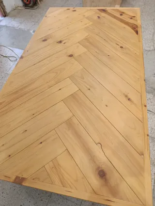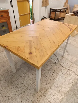 Mesa de comedor con un diseño único y acabado natural. Hecha por mi en madera maciza. - Tablero de madera con patrón de espiga. - Patas blancas de soporte.