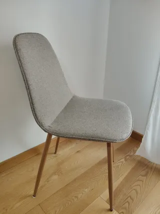 Conjunto de cuatro sillas de comedor con un diseño moderno y elegante. Perfectas para tu mesa. - Estructura de madera resistente. - Tapizado en tela suave. - Color neutro que combina fácilmente. - Comodísimas gracias al acolchado. - Muy buen estado.