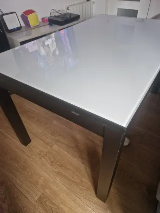 Mesa de comedor extensible, con cristal para la posición extendida. - Tablero de madera natural. - Pequeñas marcas de uso como las que se aprecian en las fotos
