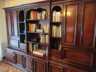 Mueble de salón de madera con vitrina y espacio para TV. - Diseño elegante en madera de cerezo. - Vitrina con puertas de cristal. - Amplio espacio de almacenamiento. - Medidas: largo 2'20, ancho 50 y de alto 2'20 Tendrían que venir a desmontarlo y llevarselo