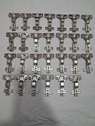 Lote de 26 bisagras metálicas para armarios de cocina. Son ideales para la instalación o reemplazo de herrajes en muebles. Se sirven con todos los tornillos. - Material: Metal resistente. - Diseño: Para montaje en puertas de muebles.