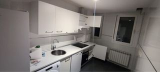 Conjunto de muebles de cocina en color blanco. Están muy bien cuidados, prácticamente nuevos. - Tres muebles altos, uno de ellos con doble puerta, y campana extractora - Encimera - Dos muebles bajos - Grifo y fregadero de acero inoxidable - Diseño moderno y funcional. - Fabricados en madera y plástico. - No se vende frigorífico, ni lavadora, ni horno, ni vitrocerámica