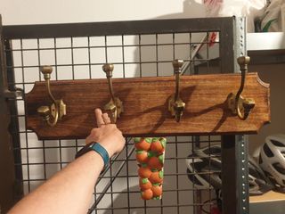 Perchero de pared de madera con cuatro ganchos de metal. Tiene un acabado en color marrón oscuro con detalles dorados. Se encuentra sin desenvolver - Estilo vintage. - Ideal para cualquier entrada.