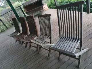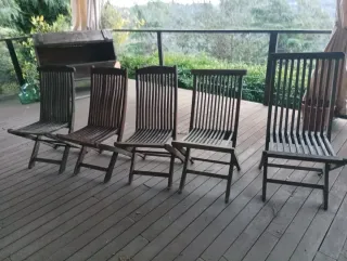 sillas de madera, perfectas para tu terraza o jardín. Su diseño clásico se adapta a cualquier espacio exterior. - Fabricadas en madera resistente. - Acabado en tonos marrones y grises. - Hay 5 und. - 5€ por unidad. - Recogida: zona Vallvidrera Barcelona