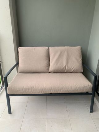 Sofá de dos plazas perfecto para jardín o terraza. Tiene un par de defectos de uso (ver imagenes). - Estructura metálica ligera. - Cojines de tela en color beige.