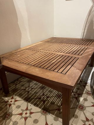 Conjunto de mesa y sillas para exterior, perfecto para disfrutar de tu jardín o terraza. - Mesa de madera con acabado natural. - Sillas con estructura de madera y asientos cómodos. - Diseño elegante y funcional.medidas abierta 2'50 cerrada 1'60cm transporte a cargo del comprador no se hacen envíos.