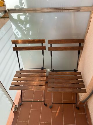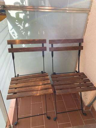 Conjunto de mesa y dos sillas plegables de exterior de Ikea. Ideal para patios o balcones. - Estructura de metal negro. - Tablero y asientos de madera. - No se ha usado.