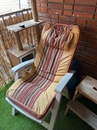 Sillón reclinable para exterior con un diseño de rayas. - Cojín acolchado. - Respaldo ajustable. - Estructura blanca. Medidas en curso.
