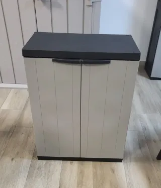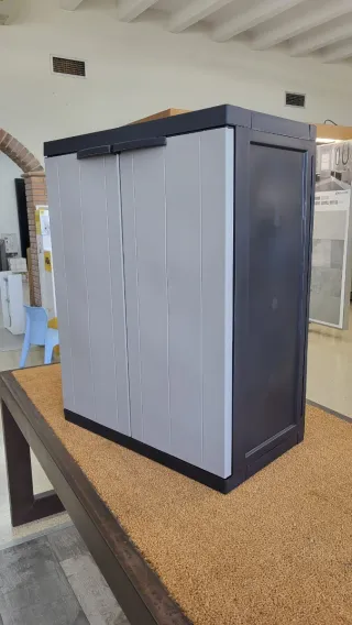 Armario de exterior con un diseño moderno y funcional. Ideal para organizar tus pertenencias en espacios exteriores. MUEBLE BAJO DE 2 PUERTAS Y BALDA REGULABLE. APTO PARA INTERIOR. MAXIMO PESO POR ESTANTE 20 KGR. CON CERRADURA.