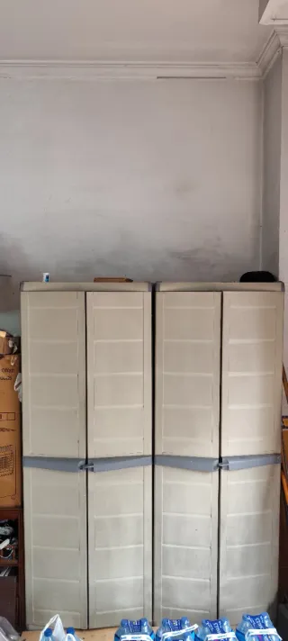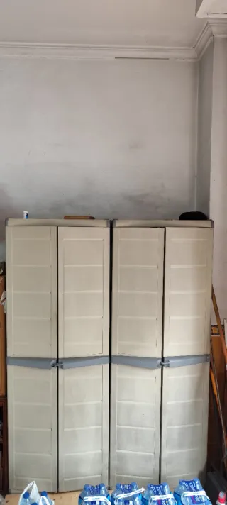 Conjunto de armarios de exterior fabricados en plástico resistente. - Color beige y gris. - Diseño de puertas con paneles. - Ideal para exteriores. - 175x75