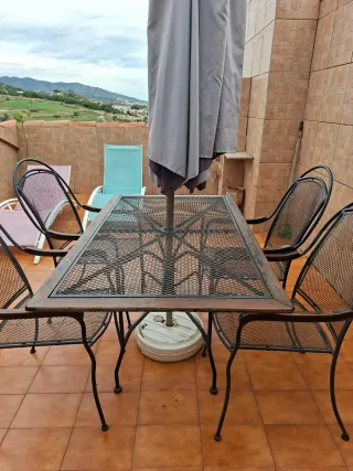 Conjunto de balcón de Maisons du Monde. Ideal para espacios exteriores y apto para mascotas (fácil limpieza) La estructura es de metal y tiene una mesa con la superficie de cristal. Lo utilicé por 2 meses por mudanza (desgraciadamente no me cabe ahora). Es comodissimo, palabra. No tengo fotos montado que no salgamos nosotros, perdón. Está desmontado por tema espacio, pero si se necesita foto de algo no hay problema. También tengo las instrucciones y la garantía. Me costó 160€, se puede mirar por internet.