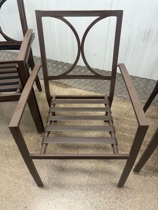 Conjunto de 6 sillas de exterior con un diseño moderno y elegante. - Estructura robusta de metal. - Acabado en color marrón. - Asiento y respaldo con correas resistentes.