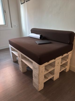 Sofá hecho a mano con palets de madera, ideal para exteriores. Cuenta con ruedas para facilitar su movilidad. - 2 sofas disponibles. - Estructura de madera. - Ruedas incorporadas.