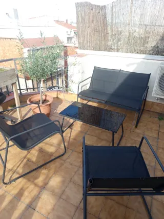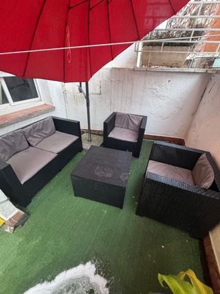 Conjunto de muebles de exterior para terraza o jardín. - Sofá de dos plazas. - Dos sillones individuales. - Mesa de centro. - Cojines incluidos. PEQUEÑA ROTURA EN UNO DE LOS SILLONES COMO SE PUEDE VER EN LA FOTO, lo demas todo perfecto.