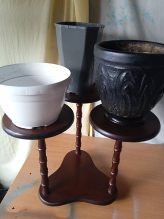 Elegante mueble de madera con tres niveles para exhibir tus plantas. Mide 38 alto y de estante a estante 43. Es desmontable. Hay cinco fotos.se puede poner macetas o otros usos. - Diseño de tres niveles. - Base estable y ancha. - Patas con detalle de nudos. Visita mi perfil y encontrarás productos interesantes