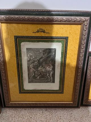 Conjunto de tres cuadros decorativos, ideales para añadir un toque especial a tu dormitorio o salón. Cada pieza presenta un diseño clásico con marcos ornamentados. - Marco exterior con acabado en madera oscura y detalles dorados. - Paspartú interior en color amarillo vibrante. - Lámina central con grabado artístico.