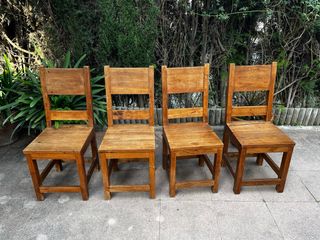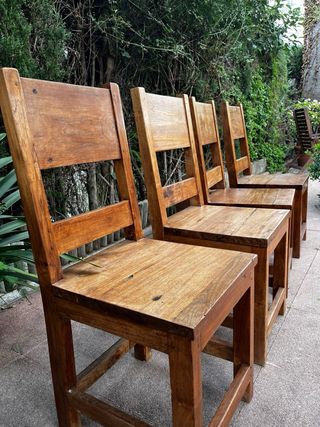 Conjunto de cuatro sillas de madera de tek. - La madera de tek es una madera tropical fuerte, dura y resistente al agua. Como no se estropea fácilmente con la lluvia o el sol, se usa mucho para muebles de exterior, barcos y suelos. Además, dura muchos años. Proviene del árbol de teca - Chat GPT. - Usadas pero sin marcas de uso. - Provienen de Bali. No se venden separadas.
