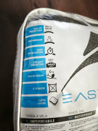 Toldos velas triangular de la marca Easy Shade, ideal para crear sombra en exteriores. Su diseño permite una fácil instalación y ofrece protección. - Tejido de poliéster de alta densidad. - Costuras selladas para mayor durabilidad. - Capa de 2xPU para resistencia. - Impermeable