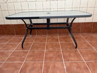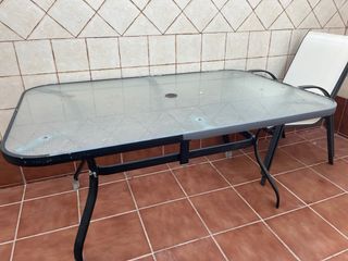 Mesa de jardín con superficie de cristal y estructura de metal.