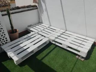 Conjunto de 3 palets de madera pintados en blanco, con ruedas giratorias; junto con los 3 cojines de color verde. Empleados en el exterior. Protegidos del sol en verano y de las lluvias en invierno. Se venden los 3 juntos.